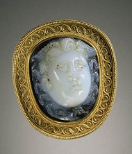 Mythological figures were fashionable subjects for engraved gems. The head of the monster Medusa was particularly popular because her snaky hair fit well into an oval format. This gem of Medusa is a cameo, a type of gem carved in relief from two-colored layered stone.