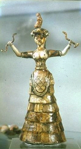 Some of these show women holding snakes: this may be the goddess herself, or a priestess. Other figurines show the Minoan interest in nature and graceful movement, like a young man jumping on a bull's back. A number of figures are of cows or bulls, which also may have a religious meaning.