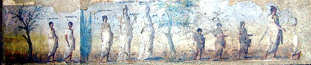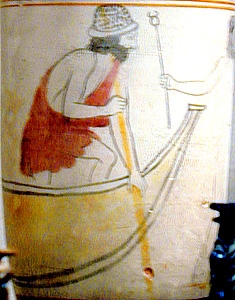 While tomb designs and grave gifts may have evolved and changed over the years, the Greeks firmly believed in a set of burial rituals. The death of Anthia in An Ephesian Tale provides evidence for these customs. “He laid her out in all her finery and surrounded her with a great quantity of gold…And there he laid her in a vault, after slaughtering a great number of victims and burning a great deal of clothing and other finery.” The family then carried out the accustomed rites (Xenophon 151). In Classical Greece the burial rituals actually consisted of three parts. First there is a prothesis, or laying out of the body. The women wash, anoint, dress, crown, cover the body and adorn it with flowers. The mouth and eyes are shut to prevent the psyche (phantom or soul) from leaving the body and the corpse is dressed in a long-ankle length garment. The body is presented so it can be viewed for two days. At the viewings, the mourners dress in black in honor of the deceased and the women stand at the head of the couch to grieve and sing while the men would stand with their palms out to the gods. When it came time for the burial, before the dawn of the third day, the body was taken to the tomb by cart. The men would lead the procession and the women would follow. At the internment the corpse or ashes would be placed in the tomb along with the grave goods of pottery, jewels, vases, or other personal property.