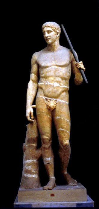 Another Greek sculptor of the classical period was Polycleitos (polly-KLY-tos), who carved the famous Doryphoros, meaning spear-carrier. Unfortunately this statue is lost, and only a later Roman version of it survives.
