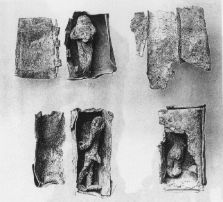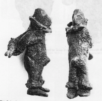 I will turn now to the construction of Kolossoi. They may be made of metal (e.g. bronze, wood, silver or lead; the latter being the most common metal), wood, clay, wax or similar malleable materials. The image is not normally realistic, since it does not depend on similarity of appearance to become connected with its Subject; that is accomplished by other means (described below). Typically the figure is nude, and often there is exaggeration of the genitals, feet or other parts; this accords with the general principle of using shocking or obscene images to ward off the evil eye and other dangers (e.g., the sign of the fig and phallic amulets).