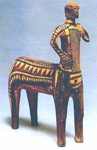 If the Greeks did not produce big statues in the Bronze Age, they certainly could not afford to in the Dark Age after it. They did go on producing little figurines, and even made a lot of them out of bronze. These are often found at religious shrines and were clearly gifts to the gods. Some of them are men in armor, and horses; a lot of them are deer.