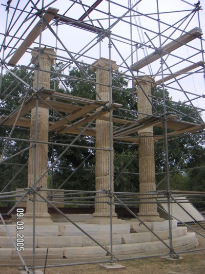 Inside the Philippeon stood 8 Corinthian half columns and 5 statues of the Macedonian royal family that depicted Philip, his wife, his parents, and his son, Alexander. The statues were created by the sculptor Leochares, and composed of gold and ivory (J. Swaddling). Like his other dedications at Olympia, the Philippeon was constructed to portray Philip not as a conqueror, but as a champion of the panhellenic ideal (P. Valavanis). Philip lived only two years after the Philippeion was commissioned. Therefore it is likely the monument was completed by Alexander after the king’s death (J. Swaddling).