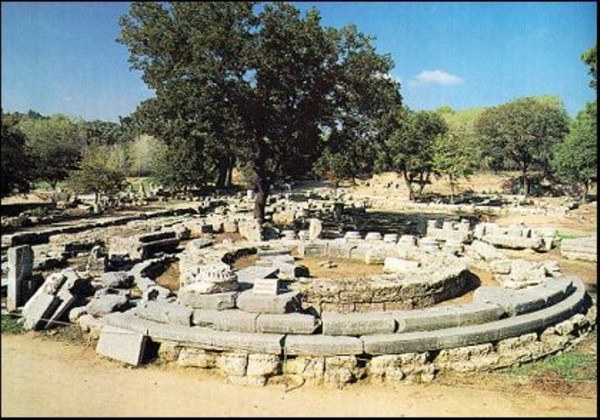 The Philippeion was erected near the west wall of the Altis in 338 BC. The circular monument was commissioned by Philip II of Macedon in celebration of both athletic and military victories. Philip had already won several chariot races at Olympia, and his victory over the Thebans and Athenians at the battle of Chaeronea presented the opportunity for a lavish dedication at the Greek sanctuary. The Philippeion stood on a marble base 15.3 meters in diameter and was comprised of 18 ionic columns covered with a carved marble roof and topped with a bronze poppy head (E. Gardiner).
