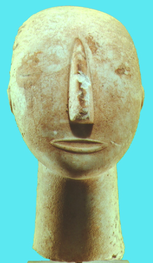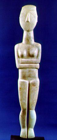 But that's not the only kind of sculpture from the Stone Age. There's another kind from later in the Stone Age. On the Cyclades islands, between Greece and Turkey in the Aegean Sea, there are tall, lifesize white marble statues of people (and more small figurines as well). They seem to have been made mainly to put in people's graves.