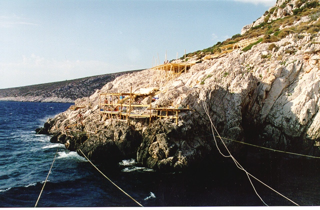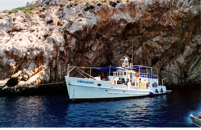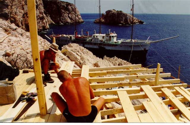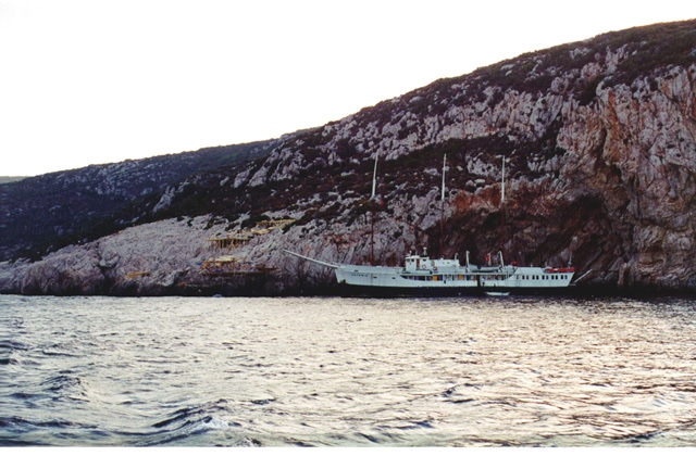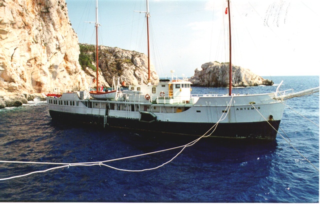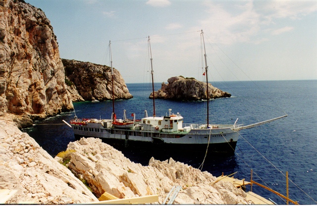 While building a camp on the jagged rocks of the cape, the team of up to 40 people lived for two months on Artemis, a former U.S. Navy wooden minesweeper, built in 1942, and on INA's own research vessel Virazon.