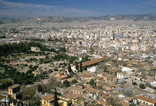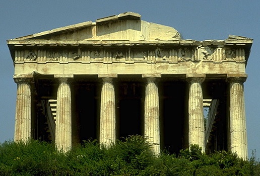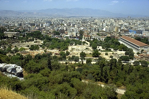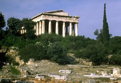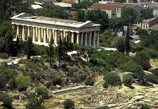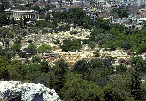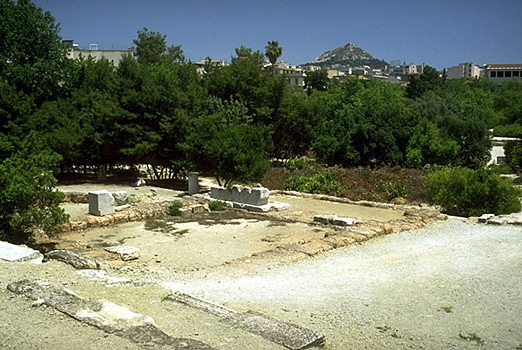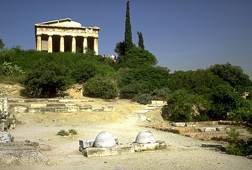 View of the Agora from the Acropolis (east of the Erechtheion). The Temple of Hephaistos is visible on the Kolonos Agoraios Hill on the left side of the photo, while the red tile roof of the Stoa of Attalos is just about in the center. Towards the lower right side of the photo you can also see the Gate of Athena Archegetis and the Roman Agora (Market of Caesar and Augustus). View from the southeast.The Athenian Agora, as seen from the Areopagus, looking north. On the left side of the photo is the Hephaisteion (Temple of Hephaistos) on the Kolonos Agoraios hill. On the right side is the Stoa of Attalos and the Church of the Holy Apostles. The Mt. Parnes range is in the background. View from the south.The Panathenaic Way and the Athenian Agora, looking toward the Acropolis. At the left side of the photo is the reconstructed Stoa of Attalos. On the right is one of the Giants from facade of the Odeion of Agrippa. The Acropolis is in the background. View from north.Altar of the Twelve Gods. Originally constructed 522/1 B.C., but with later rebuilding and repairs. View from the southwest. Only the southwestern corner of the altar is visible (the rest of the monument is actually underneath the electric railway to the north). What we see in the photos is only a low sill with cuttings and holes to attach a slabs and posts of a stone fence that once surrounded the altar. The original entrance to the altar (now hidden by the railway wall) was just to the left of the marble statue base (far left in the photo). The Altar of the Twelve Gods was considered to be the very center of the ancient city of Athens, and it was the "zero mile marker" from which distances were measured.The Leagros Base, in front of the Altar of the Twelve Gods. View from the west. The base is made of marble. The cuttings on the top surface tell archaeologists that the base originally supported a bronze statue. The inscription across the front reads "Leagros, the son of Glaukos, dedicated [the statue] to the Twelve Gods."Stoa of Zeus Eleutherios on the west side of the Agora, looking southwest. The stoa was built in around 425 B.C. It had one storey, with Doric columns on the exterior and Ionic columns on the interior. The stoa also had two projecting wings, one at north and one at south. The northern wing was mostly destroyed during the construction of the modern railway.This photo shows a detail of two rooms added the back of the stoa in the Roman period. The Hephaisteion is above. View from the northeast.Stoa of Zeus Eleutherios. View of the two back rooms added during the Roman period, looking to the northeast.West side of the Agora, looking west. On the top of Kolonos Agoraios hill is the Hephaisteion (Temple of Hephaistos). Barely visible at left is the northern edge of the Metroon. At right, the orange-red foundations belong to the Temple of Apollo Patroos. View from the east.The foundations of the Temple of Apollo Patroos. View from the southeast.Temple of Apollo Patroos, looking northeast. The conical peak in the background is Mt. Lykabettos. View from the southwest.The Athenian Agora, as seen from the Areopagus, looking north. Detail showing the Hephaisteion (Temple of Hephaistos) on the Kolonos Agoraios hill and the western side of the Agora excavations. View from the south.The Hephaisteion (Temple of Hephaistos). View from the Areopagus, looking northeast.The Hephaisteion (Temple of Hephaistos) in the Athenian Agora. View of the front (east) and north side of the temple from the areas of the Metroon.The Hephaisteion (Temple of Hephaistos) in the Athenian Agora. View of the front (east side).The Hephaisteion (Temple of Hephaistos). View from the southeast.