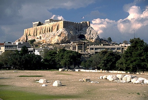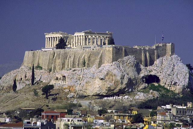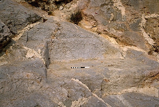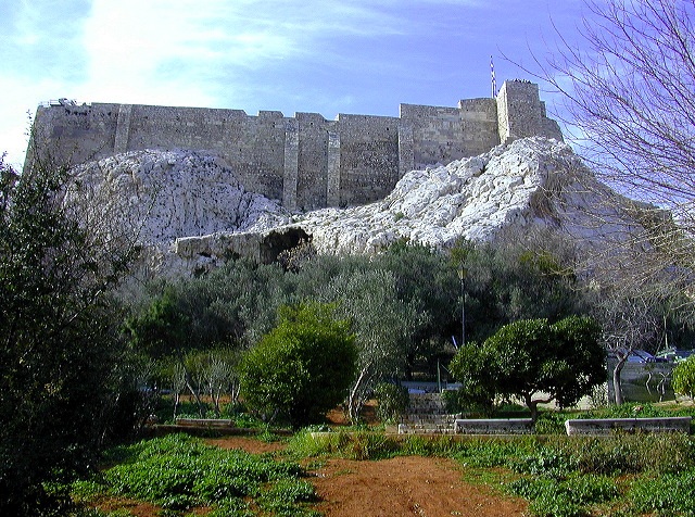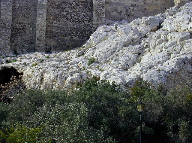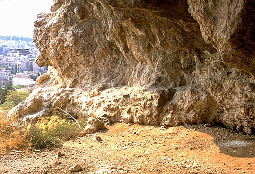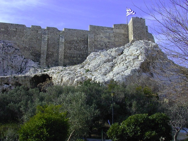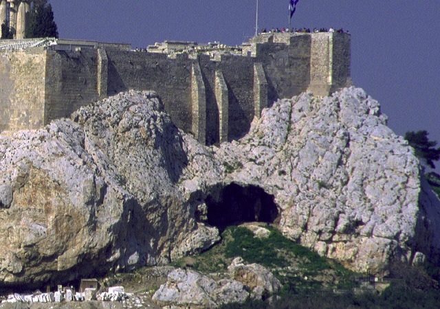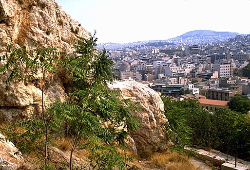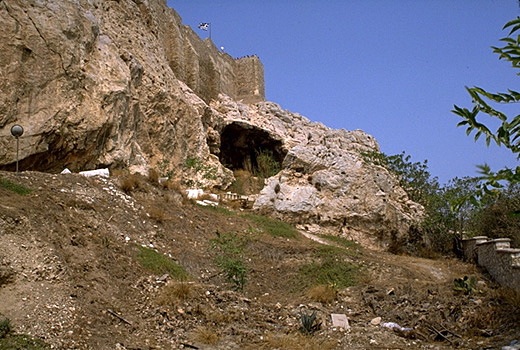 View of the Acropolis, its South and East Slopes, and the Olympieion from the Ardettos Hill. Especially prominent is the large East Cave. Note also the steep, projecting spur of rock immediately to the right of the East Cave. This is one of the steepest parts of the Acropolis and it is one of the candidates for the spot where the Persians finally scaled the citadel in 480 B.C. View from the southeast.View of the Acropolis and the East Slope from the Olympieion. In the foreground near the center of the picture, immediately below the East Cave, is the Arch of Hadrian.View of the Acropolis and the South and East Slopes from the "Temple on the Ilissos." The wall in the foreground is part of the precinct wall surrounding the Olympieion.View of the Acropolis and the South and East Slopes from the the southeast.The East Slope of the Acropolis. Detail of the preceding photo. View from the southeast.The East Slope of the Acropolis. The East Cave is near the center of the photo. View from the east. Photo taken January 30, 2000.The East Slope of the Acropolis. The cliffs on the north (right) side of the East Cave are very steep. In 1933, O. Broneer discovered some rock-cut steps that are visible in this photo, just to the right of center. (Find the street light. Follow the line of the street light straight up, to the top of the trees. The steps are visible just above the trees, to the left. ). View from the east. Photo taken January 30, 2000.The East Slope of the Acropolis. Detail showing the East Cave and the cliffs to the north (right). The rock-cut steps are visible just to the right of center in the photo. View from the east. Photo taken January 30, 2000.The East Slope of the Acropolis. Detail of the rock-cut steps discovered by O. Broneer. The steps are right in the center of the photo. There are 10 steps leading up to a larger cutting that Broneer felt was for an altar. The cliff-face in front of the steps is highly fractured, so that it is unknown if the steps originally continued down to the level of the Peripatos Path. Today, it is very steep. View from the east. Photo taken January 30, 2000.Rock-cut steps to the northeast of the East Cave. On the projecting spur of rock to the northeast of the East Cave, O. Broneer also discovered (in 1933) a series of rock-cut steps leading to a spot where the rock had been trimmed down as a bedding for a large rectangular monument, probably an altar. The steps are a little hard to see in this photo. The 20cm scale is resting on one of the steps. The next step is about 20cm above it, ascending to the left.Detail of the rock-cut steps and "altar bedding" to the northeast of the East Cave. Although this monument or altar no longer survives, these cuttings indicate that this area had some importance in ancient times.View of the East Slope of the Acropolis and the East Cave from the southeast. The large, sloping depression in the central foreground marks the spot of the trench excavated by Oscar Broneer and the American School of Classical Studies in 1939. Within this trench Broneer found a marble-paved road running east-west and aligned with the upper diazoma of the Theater of Dionysos. It is likely that this road, paved in the Roman period, formed part of a processional way leading from the Street of the Tripods (to the east) up to the Theater. The outbreak of World War II prevented Broneer from exploring this road in any detail, and the trench has now been partially filled with earth.Inside the East Cave. View of the rear of the cave, from the east. While it is likely that this prominent cave had some special significance in antiquity, there is now very little evidence preserved to tell us what this significance was. For example, there are no niches or other rock cuttings inside the cave to prove that it was used as a sanctuary (like the caves of Apollo and Pan on the north slope). O. Broneer excavated two test trenches in the cave in 1936, and found that the earth inside had all been disturbed.Inside the East Cave. View of the left (southern) side from the north.View to the northeast from the mouth of the East Cave.