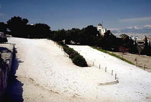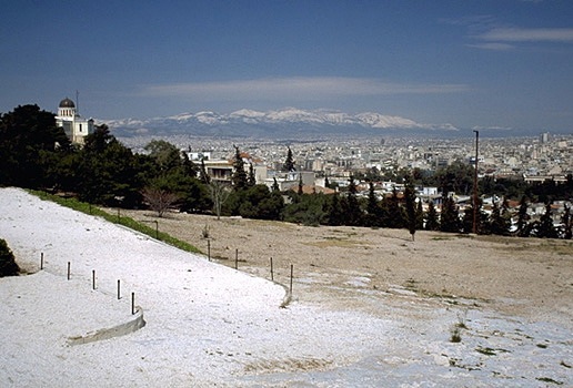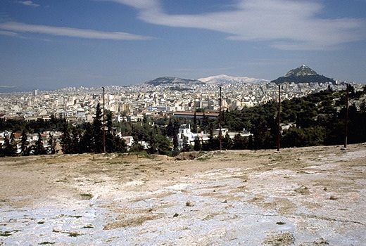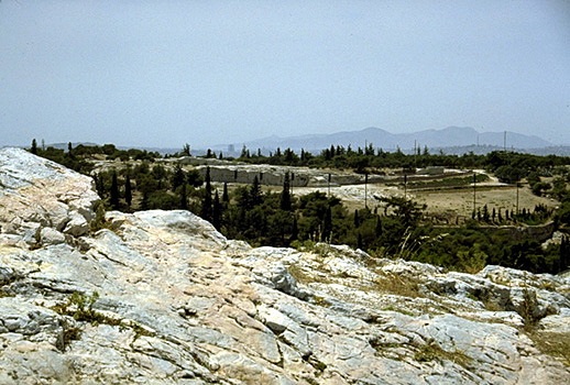 The Pnyx, as seen from the Acropolis. The Pnyx was the meeting place of the Athenian democratic assembly (Ekklesia). In the earliest phase (called Pnyx I, probably the early 5th century B.C.), people sat on the natural slope of the hill, facing a speaker's platform (Bema) on the north (to the right in this photo). In the next phase (Pnyx II, probably 403 B.C.), the positions of the speaker and the people were reversed: a retaining wall in the north was built to support an artificial embankment sloping down to the south. The speaker's platform was moved to the south, and the people sat with their backs to the north (and the Agora and their homes). In the third phase (Pnyx III, probably in the 330's B.C.), the area was made even bigger. A truly massive retaining wall was built on the north, and the bedrock of the hillside of was cut back on the south to create a speaker's platform and two vertical scarps. Most of what we see today is from Pnyx III. View from the east.