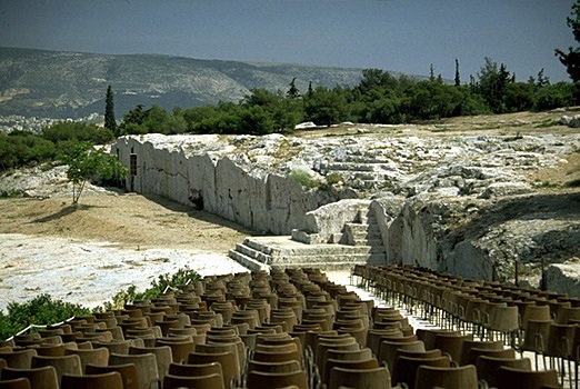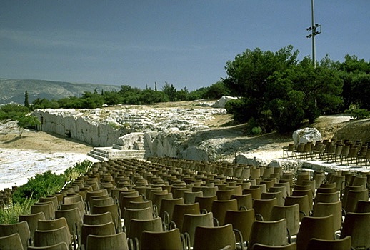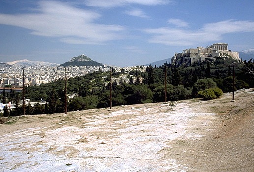 The Pnyx, as seen from the Areopagos. The Pnyx was the meeting place of the Athenian democratic assembly. In this photo you can clearly make out the vertical rock-cut scarps sloping down to the speaker's platform in the center. At the far right, you can also see part of the massive retaining wall of Pnyx III. This retaining wall must have been much higher in antiquity in order to support the earthen fill of the auditorium area. We do not know if the wall was only as high as the speaker's platform (creating a level seating area) or if it was higher (creating a sloping, theater-like area). View from the northeast.The Pnyx. The speaker's platform (Bema) and rock-cut scarp of Pnyx III are at the right side of the photo. The word "Pnyx" means "tightly packed" or "crowded", so we have to imagine several thousand Athenian male (only) citizens crowded together to listen, debate, and vote. The chairs are modern. View from the west.The Pnyx. Speakers platform (bema) and rock-cut scarp. View from the west.The Pnyx. Detail of the speaker's platform (Bema). Note also that there are more rock-cuttings and foundations in the area above (to the right) of the speaker's platform. A large rectangular cutting direclty above the Bema has been interpreted as belonging to an altar that was later moved to the Agora (Altar of Zeus Agoraios).The Pnyx. Detail of the speaker's plaftorm (Bema) of Pnyx III. The Bema was carved right out of the bedrock. View from the northwest.The Pnyx. Detail of the speaker's platform (Bema) of Pnyx III. Cuttings for marble stelai.The Pnyx. View from the speaker's plaftorm (Bema) of Pnyx III. This photo is 1 of 5 in a panorama moving from west to east (left to right).The Pnyx. View from the speaker's plaftorm (Bema) of Pnyx III. This photo is 2 of 5 in a panorama moving from west to east (left to right).The Pnyx. View from the speaker's plaftorm (Bema) of Pnyx III. The red tile roof of the Stoa of Attalos in the Agora is visible near the center of the photo. The Areopagus is just coming into view at the far right. This photo is 3 of 5 in a panorama moving from west to east (left to right).The Pnyx. View from the speaker's plaftorm (Bema) of Pnyx III. The red tile roof of the Stoa of Attalos in the Agora is visible at the left side of the photo. In the center is the Areopagus, and then the Acropolis at right. In the far distance are (from left to right): Mt. Penteli, Mt. Lykabettos, and Mt.Hymettos. This photo is 4 of 5 in a panorama moving from west to east (left to right).The Pnyx. View from the speaker's plaftorm (Bema) of Pnyx III. This photo is 5 of 5 in a panorama moving from west to east (left to right).The Pnyx. View of the rock-cut scarp and speaker's platform (Bema) of Pnyx III from the north).The Pnyx. The stepped retaining wall of Pnyx II (late 5th century B.C.) is visible near the bottom of the photo. Photo taken March 26, 2000.The Pnyx. The stepped retaining wall of Pnyx II (late 5th century B.C.). At the far right side of the photo is one of the huge limestone blocks used on the retaining wall of Pnyx III (4th century B.C.). View from the east. Photo taken March 26, 2000.