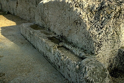 Pnyx III: The Pnyx was rebuilt and expanded in the 3rd quarter of the 4th century B.C., probably around 345-335 B.C. A massive, curved, retaining wall was built (or at least begun) on the north. The southern side of the auditorium and speaker's platform (bema) were quarried out of the natural bedrock. (Traces of the quarrying process can still be seen at the eastern side of the great rock-cut scarp). On a terrace above (south of) the speaker's platform, the foundations were begun for 2 long stoas (but these seem never to have been finished). It is unknown for how many years Pnyx III was used as the meeting place of the ekklesia, and certainly by the 1st century B.C. the the assembly held their meetings in the Theater of Dionysos on the South Slope of the Acropolis.