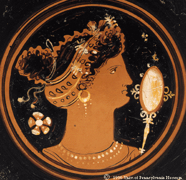 The most common toilet article appearing on vases is the mirror, usually made of polished silver or bronze. These and a wide variety of cosmetic implements are often excavated in tombs, sanctuaries dedicated to female divinities, and in the domestic quarters of ancient towns.